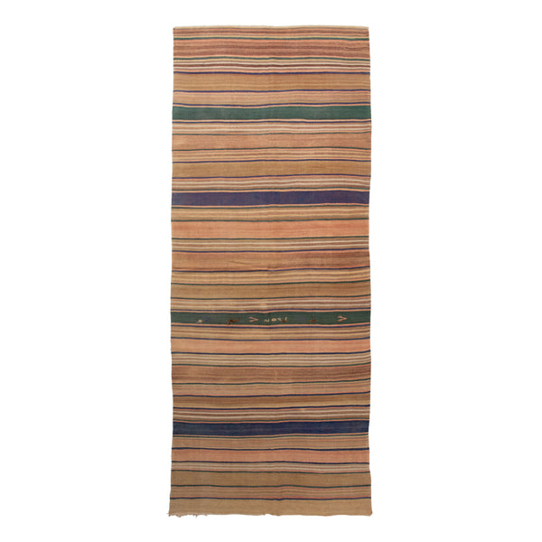 This Turkish Kilim isn't just a rug; it's an eloquent testament to the enduring allure of handcrafted beauty. Spanning a striking 5 feet by 14 feet, it transforms any space with its vibrant narrative and tactile warmth. The flat weave offers a seamless continuity with the floor, setting the stage for a visual symphony played out in horizontal stripes. The earthy tones of beige and light brown form the stalwart base, while whispering hints of peach and salmon soften the...