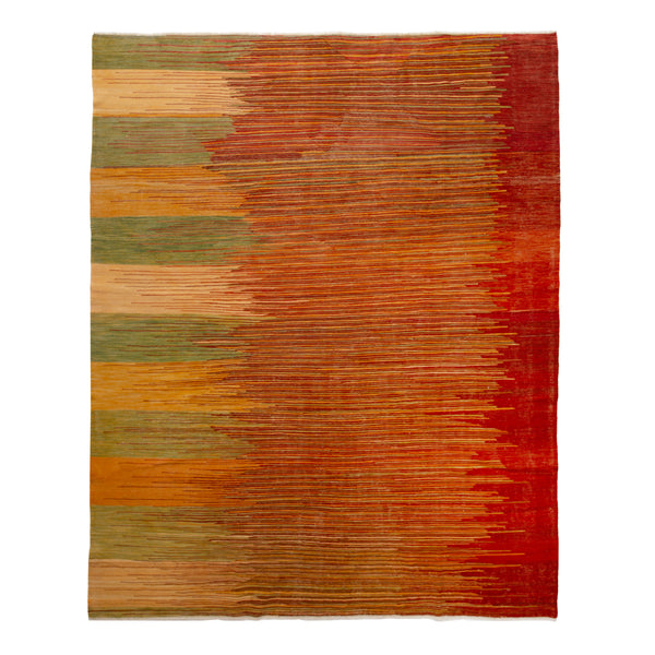 This Turkish Kilim Rug - 9' 7" x 7' 10" is handwoven by nomadic tribes using hand-carded, pot-dyed Afghan wool. The natural pigment married with the organic variation of texture composes a striated design - putting forth an earth-toned one-of-a-kind rug that will imbue all interiors with warmth and culture. Reversible and woven without knots, kilims are an effortless way to introduce ancient motifs and a rich feeling into a styled space, both modern and traditional alike.