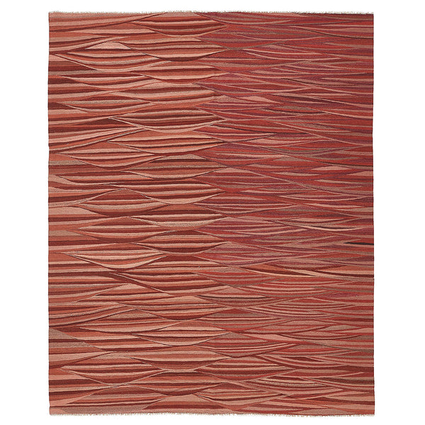A hand-woven marvel from Turkey emerges, harmonizing heritage and modern design. This Turkish flatweave wool rug, spanning an impressive 7'11" by 9'9", commands attention in any space it graces. The colors form a symphony of vibrant reds—crimson, terracotta, rust—all blending in an abstract dance of horizontal waves. A visual composition that brings texture and modern artistry to the floor, its design flows with an effortless grace. This is a kilim, a flatweave rug that thrives under heavy footfalls, ideal for...
