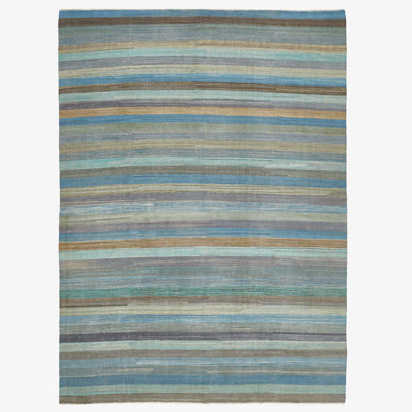 This Turkish kilim rug is woven by nomadic tribes using hand-carded, pot-dyed Afghan wool. The natural pigment married with the organic variation of texture composes a striated design - putting forth a small-batch collection of contemporary kilim rugs that will imbue all interiors with warmth and culture.