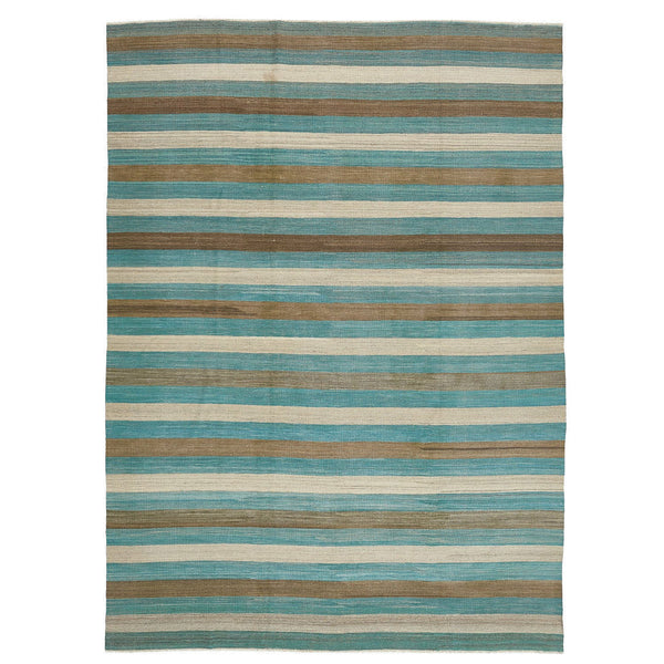 An 8'2" x 11'3" hand-woven flatweave rug defies the humdrum of domesticity with its presence. Crafted from 100% natural wool in Turkey, this rug is a testament to both endurance and elegance at 40.0 lb. Its kilim flatweave construction delivers practicality without sacrificing grace, offering a low-profile design that effortlessly embraces the daily whirl of life. Stripes span across its face, each band a deliberate stroke of color—vibrant blues dance with soothing teals, juxtaposed against ribbons of warm cream and...