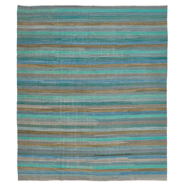 A remarkable fusion of design and functionality, the hand-woven Turkish flatweave rug offers a narrative in blues and teals. At 8'2" by 9'5", its presence is substantial, a foreground for contemporary or traditional settings. Each thread of this wool composition tells the story of Turkish artisanship, where craftsmanship meets audacity in color choice. Navy commands your attention, while sky blue provides a welcome respite, and aqua injects a playful lilt. These blues don't stand alone; they mingle with teal and...