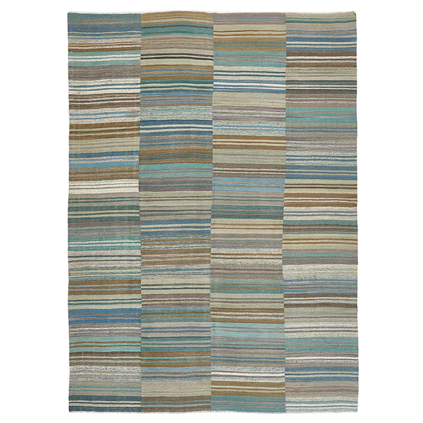 Featured in a small-batch collection of contemporary kilim rugs, this Turkish kilim rug is woven by nomadic tribes using hand-carded, pot-dyed Afghan wool. The natural pigment married with the organic variation of texture composes a striated design - putting forth an earth-tone rug that will imbue all interiors with warmth and culture.