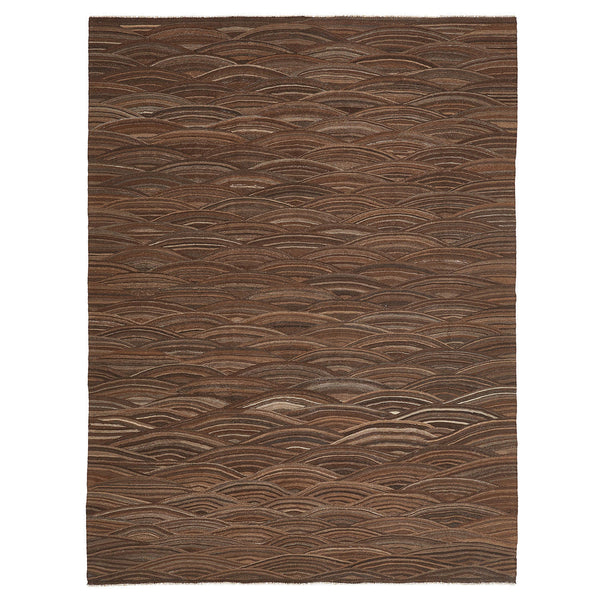 A hand-woven Turkish flatweave wool rug measuring an impressive 9 feet 2 inches by 11 feet 11 inches transforms a room into a serene haven. Not just a rug but a year-round partner in comfort, wool's natural properties cushion steps and moderate temperatures. The rug's design, a symphony in brown, is a visual ballet. A dance of undulating, organic wave-like patterns emerges, casting shades from deep earthy chocolate to warm mocha, flecked with lighter beiges. This tapestry of color isn’t...