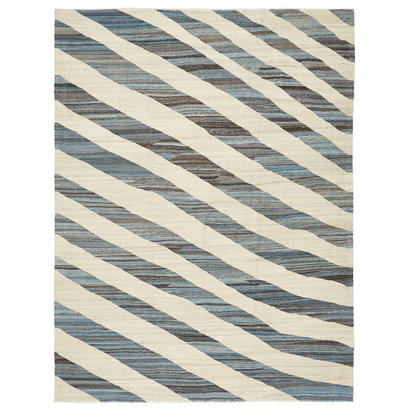 This hand-woven Turkish flatweave wool rug isn't just floor covering; it's an art piece that commands attention without overwhelming. At 9 feet 3 inches by 12 feet 2 inches, its size alone brings presence, but it's the intricate dance between color and form that truly captivates. Drawing on a spectrum of blues — from gentle sky hues to the profound depth of slate — each stripe cuts diagonally across a creamy, off-white expanse. This striking interplay creates movement and vitality,...