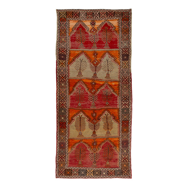 A red traditional wool rug, originating from the heart of Turkey, speaks volumes without uttering a single word. At an impressive 5'7" by 12'9", this hand-knotted piece of artistry blends deep, rich reds with vibrant orange hues, interwoven with neutral beiges and shadowy accents. Its color palette whispers of ancient tales, inviting you to tread softly on the warmth of its wool, crafted with unwavering dedication by skilled artisans. This isn't just a rug; it's an invitation to experience another...