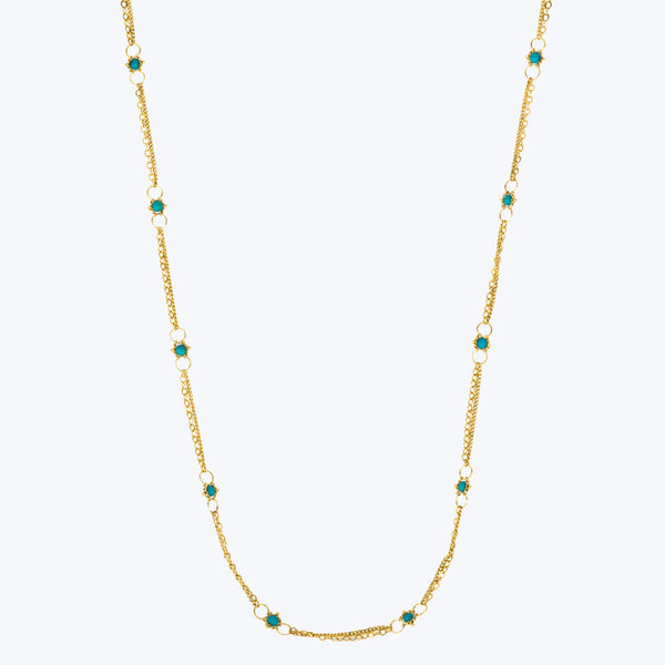 The Turquoise 18k Whisper Chain Necklace boasts beautiful stones and an intricately woven chain that's designed to elegantly cascade around the neck — making it a sophisticated addition to any jewelry collection.