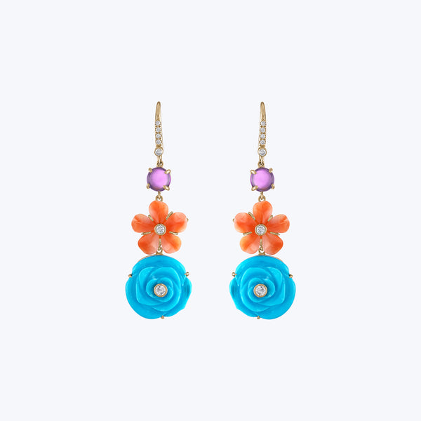 Turquoise, Coral, Amethyst Diamond Flower Drop Earring