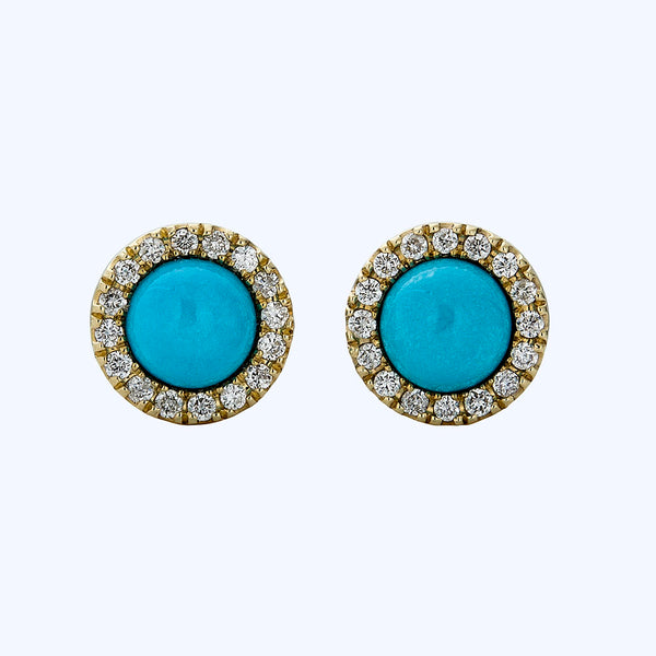 The contemporary Turquoise Diamond Studs are crafted in 14K yellow gold with a round turquoise center stone and diamond border. Post back.