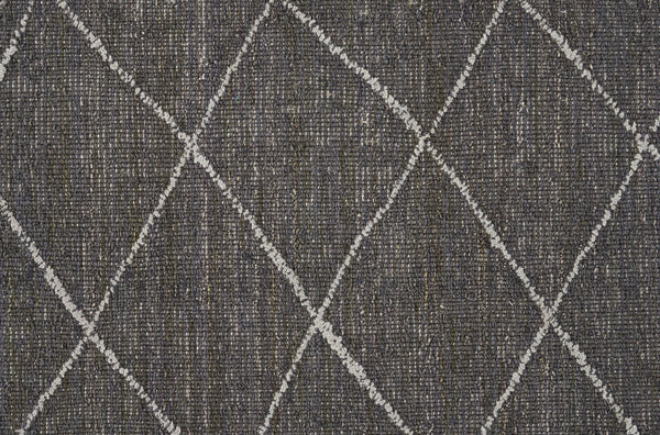Urban Custom Carpet features a modern geometric pattern of intersecting white lines on a dark background. Hand-loomed in India from 100% Wool, this high-end rug adds texture and quality to any space. Perfect for adding a touch of sophistication to your home decor.