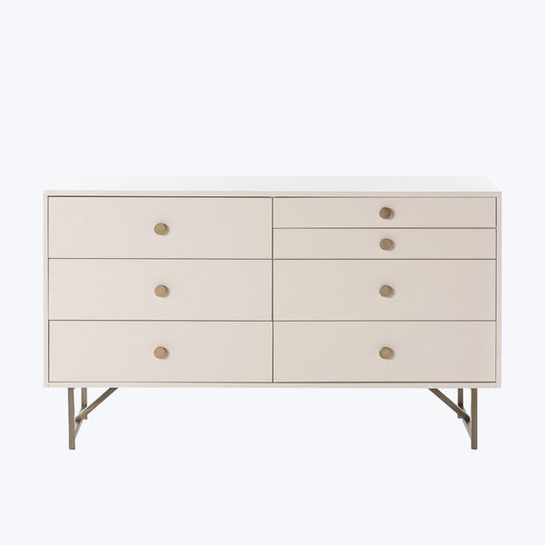 Crafted in engineered hardwood, the Van 7-Drawer Dresser is finished in a dreamy off-white hue complemented by aged brass-coated hardware. In addition to its five spacious drawers, the Van 7-Drawer Dresser features two smaller ones lined in velvet, ideal for storing jewelry. An elegant addition to contemporary spaces.