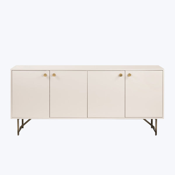 Discover the Van Sideboard by Four Hands. Featuring clean lines and an elegant off-white finish, this sleek piece makes a beautiful addition to light, contemporary interiors. The Van Sideboard is crafted in a blend of engineered hardwood and solid parawood, and detailed with brass-coated iron hardware. Enjoy ample storage for serveware and table linens, as well as rear cutouts for discreet cord management.