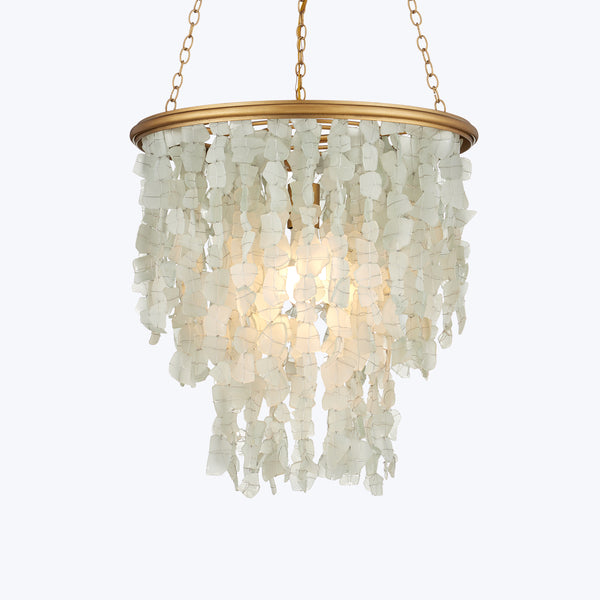 Discover the Verre de Mer Chandelier by Currey & Company. Handcrafted in gold-finished wrought iron, this elegant chandelier is adorned with recycled sand-blasted glass, cut to resemble pieces of sea glass. Each sustainable glass piece is wrapped in wire and attached to the frame by hand, a process requiring patience and artisanal precision. The four layers of pale green glass are illuminated by a single light. A stunning fixture, perfect for bringing warmth to contemporary spaces. Available in small, medium,...