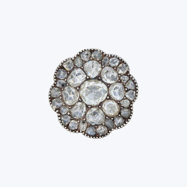 A beautiful example of Georgian jewelry with the closed-backed rose cut diamonds in a fluted, cluster style. The diamonds shimmer very softly as one's hand moves.