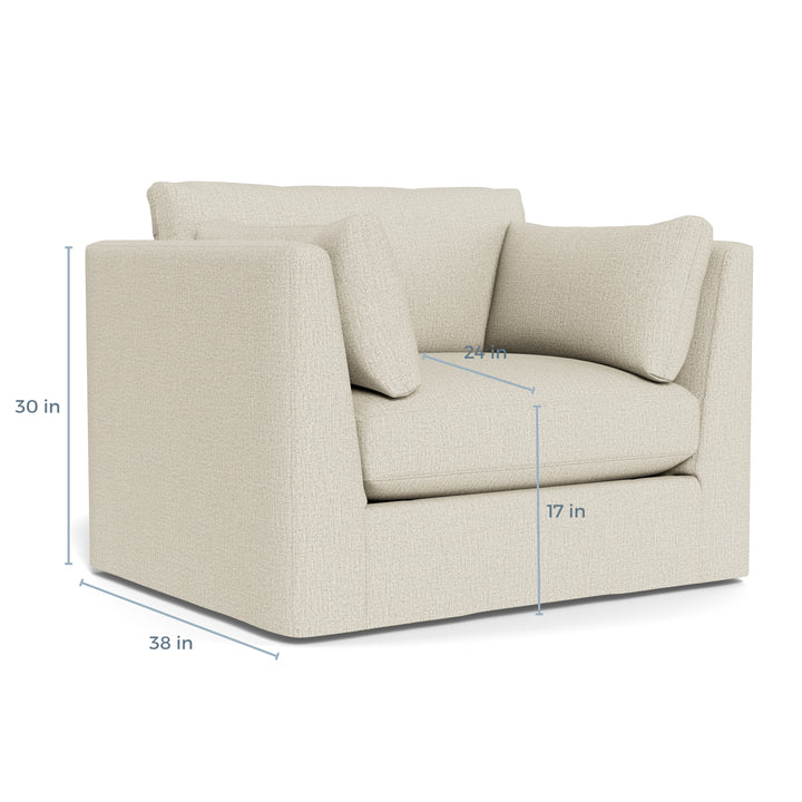 Specifications include foam-wrapped seat cushions with a blend of fiber and feather/down for even fill distribution, and back cushions featuring a fiber and feather blend encased in a down-proof casing. The fill is Responsible Down Standard certified and meets USDA hypoallergenic regulations, guaranteeing peace of mind for allergy sufferers. Additionally, this chair is free from flame retardant chemicals, prioritizing safety and environmental sustainability.