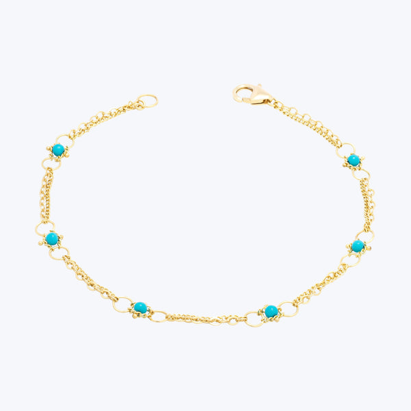 Discover the Whisper Chain Bracelet in Turquoise by Amáli, a delicate piece packed with quiet, elevating impact. Featuring a stunning arrangement of 18K gold links and chains, this beautiful bracelet showcases Amáli’s mastery of craft. Tiny turquoise spheres add a pop of complementary color. Handcrafted in the USA.