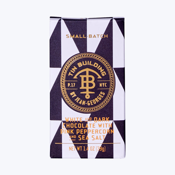Discover the White & Dark Chocolate with Pink Peppercorn and Hawaiian Sea Salt from the Tin Building by Jean-Georges. Blending beautiful packaging with divine contents, this decadent treat makes a perfect gift for holiday gatherings.