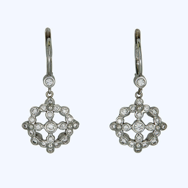 Introducing the White Gold Diamond Circle Cross Earrings. These elegant silver-toned earrings feature a beautiful circular ornament with intricate designs and diamond stones. Made from 18k White Gold and a 1 ct. Diamond, these earrings have a vintage feel and are perfect for formal occasions.