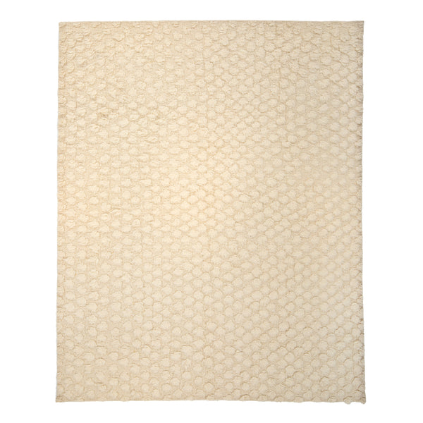 This White Moroccan Wool Rug - 8'3" x 9'8" showcases a neutral beige color with a textured, circular pattern that creates a soft, three-dimensional look. Hand-knotted in India out of high-quality wool, this Moroccan rug adds a touch of elegance to any interior setting.