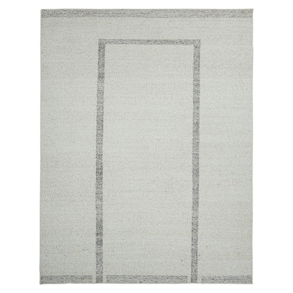 This White Moroccan Wool Rug - 8'9" x 11'8" is a sophisticated addition to any space. Hand-knotted in India, this wool rug boasts a minimalist design with a light gray color and a darker gray border for a framed look. Its high-quality construction and elegant texture make it a standout piece in any room.