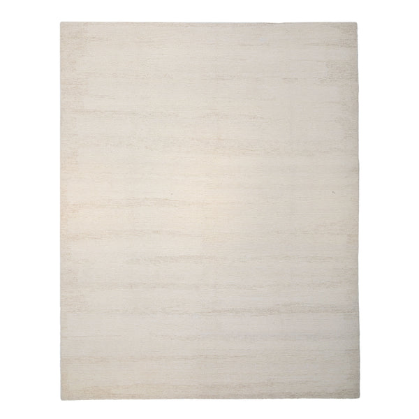 This 8' x 10' area rug provides a versatile foundation for various interior spaces. Constructed from natural wool fibers, this piece offers both durability and a soft feel underfoot. The rug is hand-knotted by artisans in India, a traditional method that ensures a robust and lasting construction. This handcrafted technique contributes to the rug's quality and individual character. Featuring a solid white color, the rug incorporates a subtle texture. This texture is created through variations in the wool pile, presenting...