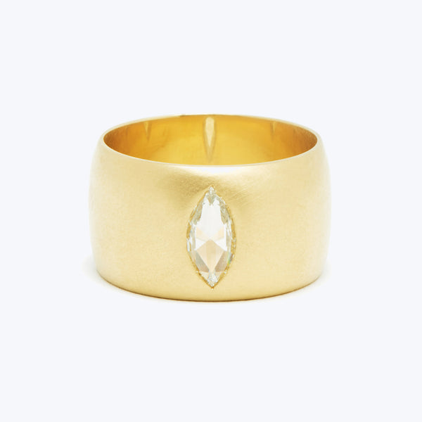 This Wide Gypsy Band features a stunning marquise-shaped rose-cut diamond set in matte 18k yellow gold. This one-of-a-kind 5.5 mm gold ring features a rounded profile and soft edges, making it weighty yet comfortable. 0.38ct diamond.