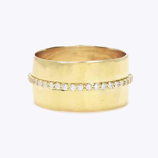 This Wide Hammered Eternity Band features a linear pop of sparkle that creates an all-in-one stacked look. Enjoy warmth and texture with this statement ring. 18k polished yellow gold with a hammered finish and white diamonds.