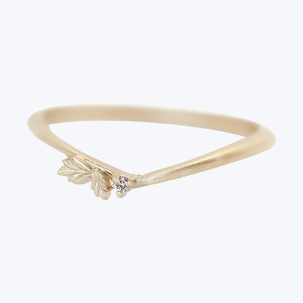 This Wood Nymph Faye Asymmetrical Guard Ring is hand-crafted from recycled 18k yellow gold into a subtle arc to cradle your engagement ring, with offset leaves and a sweet little sparkle from a round brilliant cut diamond (.01ct). This asymmetrical floral diamond ring serves as a lovely wedding band or addition to your ring stack. Finished with Megan Thorne's signature matte finish and polished, hand-carved details. Size 6. Please contact us to special order for other sizes. Meet the Maker: Working as a...