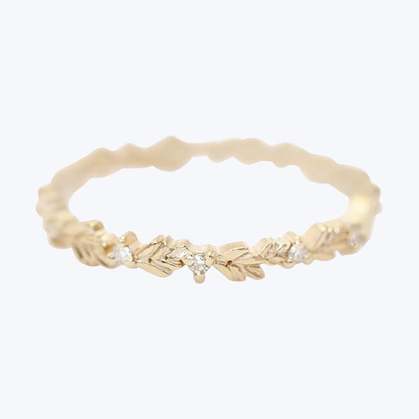 This Wood Nymph Faye Slender Band is hand-crafted from recycled 18k yellow gold into a timeless eternity band featuring dancing leaves twirling around your finger with round brilliant cut diamonds (.1tcw) nestled in their botanical bounty. Organic, sweet, and the perfect amount of sparkle, this diamond ring serves as a lovely wedding band or addition to your ring stack with its cool silhouette and diamond pop. Finished with Megan Thorne's signature matte finish and polished, hand-carved details. Size 6. Please...