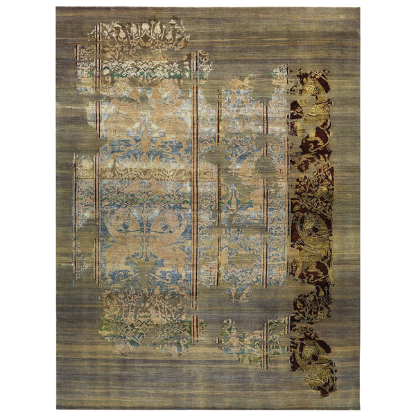 This hand-knotted rug, part of the Alchemy Collection, combines traditional construction methods with a contemporary design. It measures 9 feet 3 inches by 12 feet 2 inches, making it suitable for larger rooms and open-plan spaces. The rug features a complex, multi-tonal pattern. While designated as Yellow, its color palette includes muted golden tones, pale blues, soft greens, and earthy browns, resulting in a sophisticated, antique-inspired appearance. The design incorporates intricate motifs that appear faded and deconstructed, lending the rug...