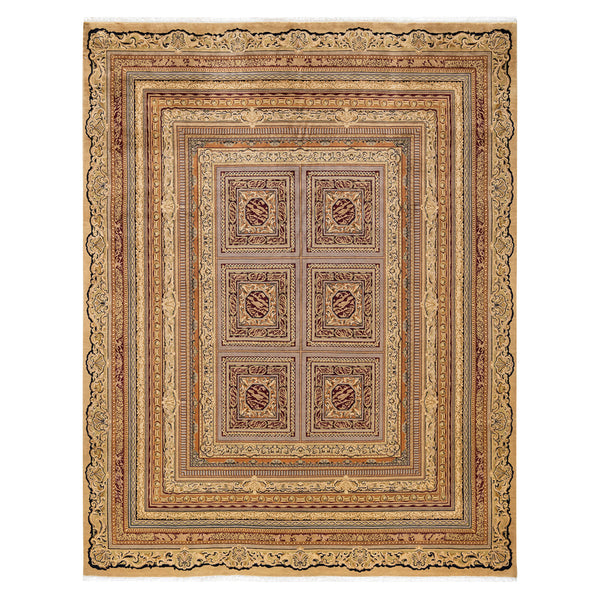 This Yellow Traditional Mogul Wool Rug measures 8 feet by 10 feet 3 inches, offering a substantial foundation for various interior spaces. Hand-knotted from durable wool, this rug originates from Pakistan, reflecting traditional craftsmanship and design. Its primary color is yellow, complemented by a rich palette of gold, beige, brown, and subtle accents of maroon and light grey within its intricate patterns. The rug's design features a sophisticated central field, composed of six distinct square panels, each containing an ornate...