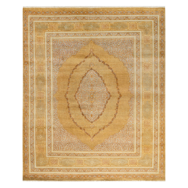 This Yellow Traditional Mogul Wool Rug measures 8 feet 1 inch by 9 feet 8 inches, offering a classic design for various interiors. Crafted from wool and hand-knotted, this piece originates from Pakistan. The rug features a traditional Mogul design with a central medallion. This medallion has an elongated, intricate shape, surrounded by a field filled with detailed floral and vine motifs. Multiple borders frame the central design, each showcasing distinct patterns that complement the overall aesthetic. The primary yellow...