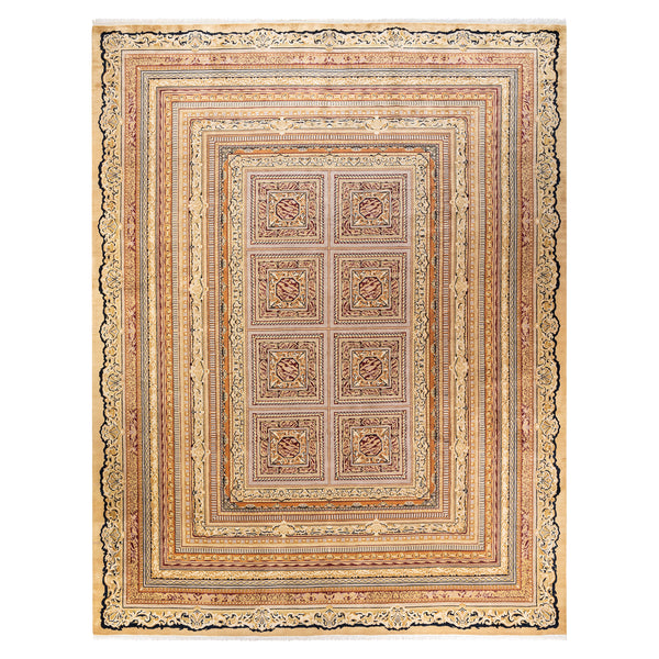 This Yellow Traditional Wool Rug measures 9'1" x 12'3", offering a substantial size for various living spaces. It is a hand-knotted piece, crafted from 100% natural wool, known for its durability and soft texture. The rug originates from Pakistan, reflecting the country's rich tradition in rug making. The design features a traditional aesthetic with a multi-bordered pattern. The central field contains a grid of squares, each housing an intricate medallion motif. Multiple layers of borders frame this central design, incorporating...