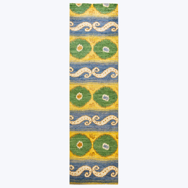 This Yellow Traditional Wool Runner - 3' x 11' 6" comes from India. Hand-knotted from high-quality wool, it features a colorful pattern with alternating green and yellow bands. Its intricate design makes it bold and unique.