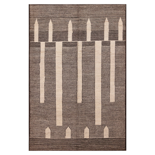 This Brown Zameen Contemporary Wool Rug is a modern masterpiece from India. Hand Knotted from Wool, this 6'2 x 9'4 Contemporary rug features an abstract geometric pattern in contrasting shades, resembling a stylized fence or barrier. The high quality craftsmanship and minimalist aesthetic make it a stunning addition to any space.