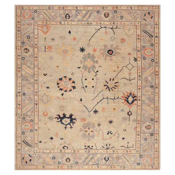 This Beige Traditional Wool Rug - 8'4" x 9'5" is a hand-knotted rug from India. Featuring a soft beige base with intricate floral and geometric motifs in muted shades of blue, orange, brown, and black. The craftsmanship suggests it is handwoven, giving it a unique texture and quality. Add a touch of decorative comfort to your space with this beautiful and high-end traditional rug.
