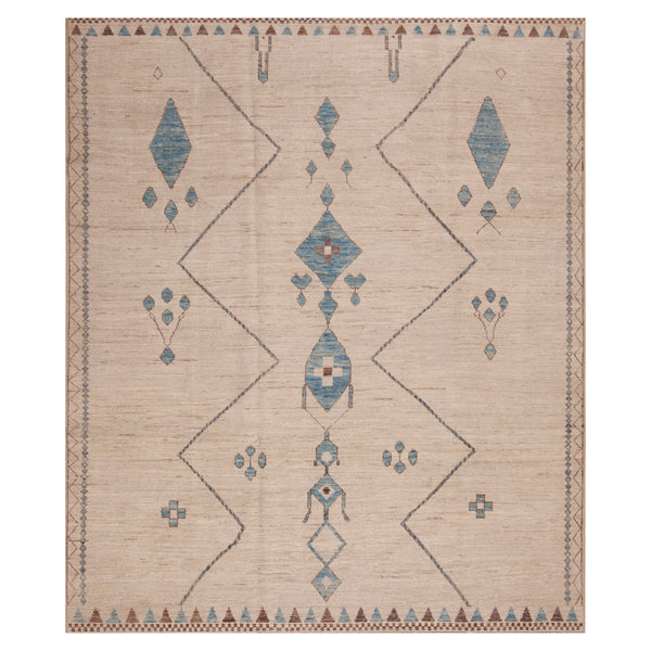 This Ivory Zameen Traditional Wool Rug is a stunning piece of home decor with a neutral color scheme of beige, blue, and brown. Hand-knotted in India, this 8'5" x 9'8" traditional rug features a symmetrical geometric pattern inspired by tribal and ethnic styles. Made of high-quality wool, this rug adds elegance and cultural flair to any room.