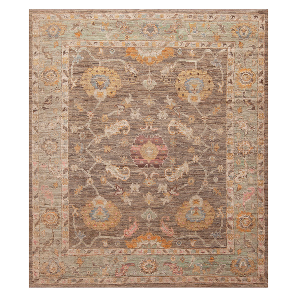This Brown & Green Traditional Wool Rug, sized 8'7" x 9'10", is a masterpiece from India. Hand knotted with wool, this traditional rug features intricate patterns in muted tones of blue, orange, beige, and pink. The detailed floral and geometric motifs create a vintage look, showcasing elegance and historical artistry. A classic addition to any home.