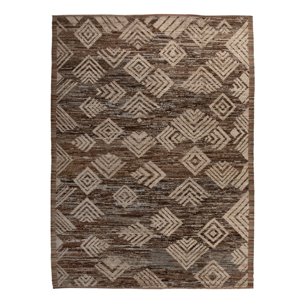 The Brown Zameen Transitional Wool Rug, measuring 10 by 14 feet, offers a significant presence for various interior settings. This area rug features a design that bridges classic and contemporary styles, making it suitable for diverse decor. Crafted from natural wool, it provides both durability and a soft texture underfoot. Its construction is hand-knotted, a technique indicative of quality craftsmanship and long-lasting wear. This rug's aesthetic is characterized by a rich brown color palette, incorporating varying shades from deep chocolate...
