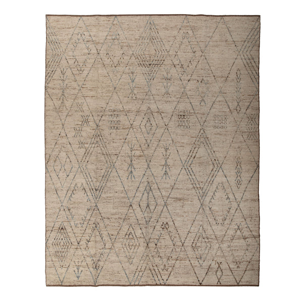 Inspired by the grounding foundations of Earth's natural colors and pure materials, this Beige Zameen Transitional Wool Rug - 10'5" x 13'9" features a variety of geometric patterns in cream, beige, and blue tones. This geometric design is reminiscent of the angular lines of mountains and valleys while paying homage to traditional tribal rug designs of history's past.The neutral color palette in this textured wool rug is made from a unique blend of recycled wool that comes from the sheering...