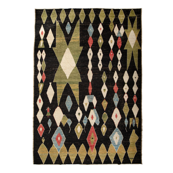 This Zameen Transitional Wool Rug is a hand-knotted piece crafted in Central Asia. It features a robust wool construction, offering durability and a soft underfoot feel. The rug measures 14 feet by 19 feet 3 inches, making it suitable for larger living areas, dining rooms, or open-concept spaces. The design showcases a multi-color geometric pattern on a black background. Large and small diamond motifs are arranged across the field, incorporating shades of olive green, cream, light blue, and muted red....