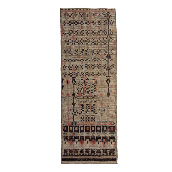 This hand-knotted Brown Zameen Transitional Wool Rug measures 3'4" by 9'6", an ideal size for a runner. It is crafted from durable wool in Central Asia, combining traditional artistry with a contemporary aesthetic. The rug features a light, natural background in shades of beige and off-white. This base sets off geometric patterns primarily in dark brown and black, offering depth and definition. Accent colors of muted red, soft pink, and subtle light blue are woven throughout, providing visual interest without...