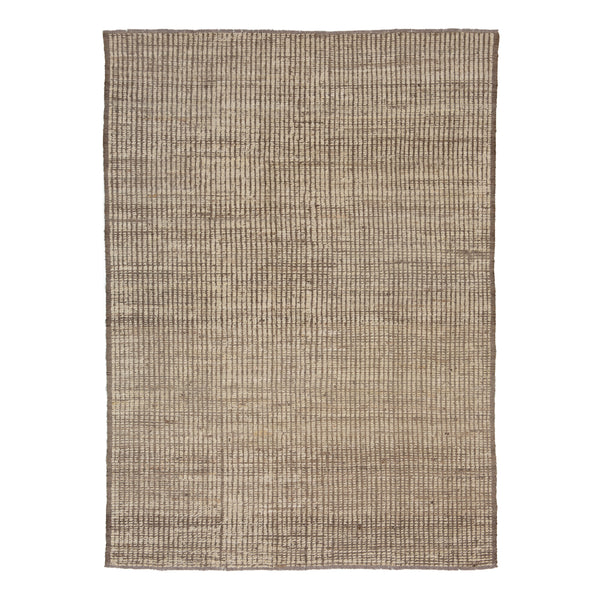 The Brown Zameen Modern Wool Rug is a transitional piece designed to complement a range of interior styles. Measuring 6'11" by 9'6", this rug features a distinct textural pattern. Its surface displays an interplay of natural brown tones, creating a subtle visual depth. The design incorporates structured vertical lines with subtle horizontal woven elements, resulting in a contemporary yet classic appearance. Constructed from wool, this rug offers durability and a soft underfoot feel. Wool is a natural fiber known for...