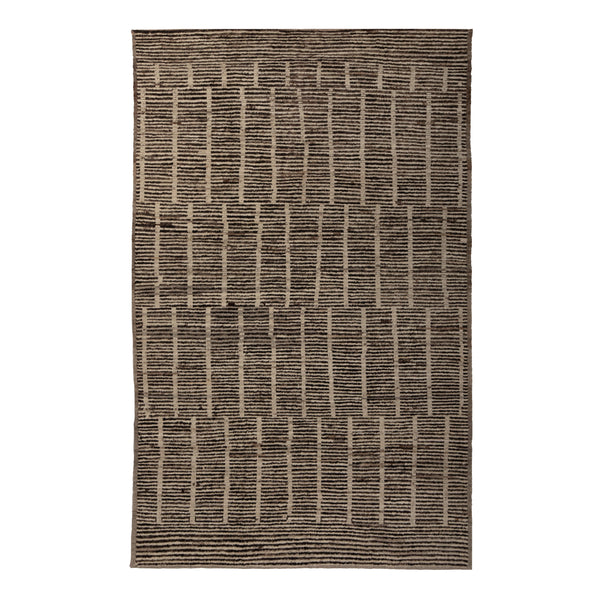The Brown Zameen Transitional Wool Rug measures 6'4" x 9'10", providing a versatile floor covering for various rooms. This hand-knotted rug features a design that merges classic techniques with a modern pattern. Crafted from wool, the rug displays a primary brown color palette. Its surface is characterized by a distinctive geometric pattern formed by dark brown, almost charcoal, horizontal stripes intersected by finer, light beige vertical lines. This creates a structured, grid-like appearance that adds visual interest and texture to...
