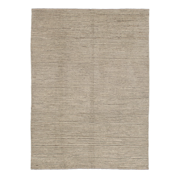 This Cream Zameen Transitional Wool Rug, measuring 7'8" x 10', offers a balanced design for various interiors. It is hand-knotted from natural wool, ensuring a durable and soft underfoot experience. Originating from Central Asia, this piece reflects traditional craftsmanship. The rug features a cream base color, accented by subtle, thin horizontal lines across its surface. This striped pattern provides a visual texture that adds depth without introducing a bold print, maintaining a refined aesthetic. The use of wool contributes to...