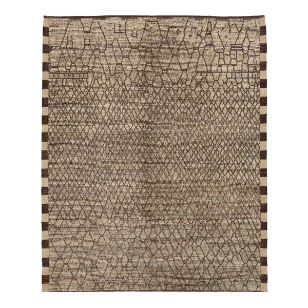 The Brown Zameen Transitional Wool Rug - 8'2" x 9'9" provides a distinct foundation for any room. This hand-knotted area rug combines traditional craftsmanship with a contemporary aesthetic, making it suitable for diverse interior styles. Constructed from 100% natural wool, this rug offers a soft underfoot feel and inherent durability. Wool is a resilient fiber, naturally resistant to stains and wear, making it suitable for active areas. The hand-knotted method, a traditional craft from Central Asia, highlights the artisanal skill...