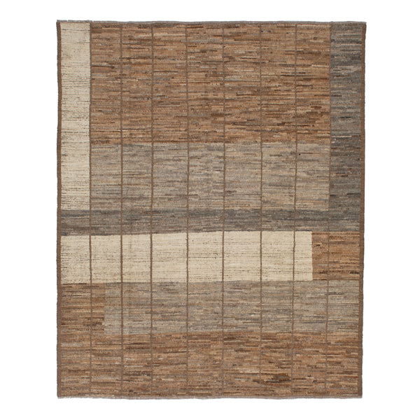 The Brown Zameen Transitional Wool Rug measures 8'6" x 10', offering substantial coverage for various living spaces. This rug is hand-knotted from durable wool in Central Asia, combining traditional craftsmanship with a contemporary aesthetic. Its transitional design features a geometric pattern composed of varied horizontal color bands and vertical line work. The primary color is brown, presented in a spectrum of warm brown shades that are complemented by accents of light beige and subtle gray tones. This blend creates a...