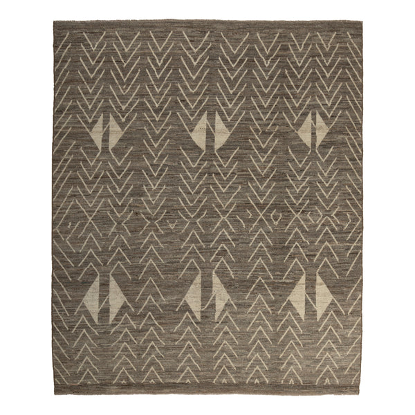 The Brown Zameen Modern Wool Rug measures 8'7" x 9'6", providing a substantial area rug for various living spaces. This transitional piece is crafted from 100% wool, offering both durability and a soft texture underfoot. Its design seamlessly blends contemporary aesthetics with traditional hand-knotted construction. This Zameen rug features a brown base color, complemented by an intricate pattern in a contrasting light, off-white hue. The design incorporates repetitive chevron lines arranged in vertical columns across the field. Larger, stylized arrow...