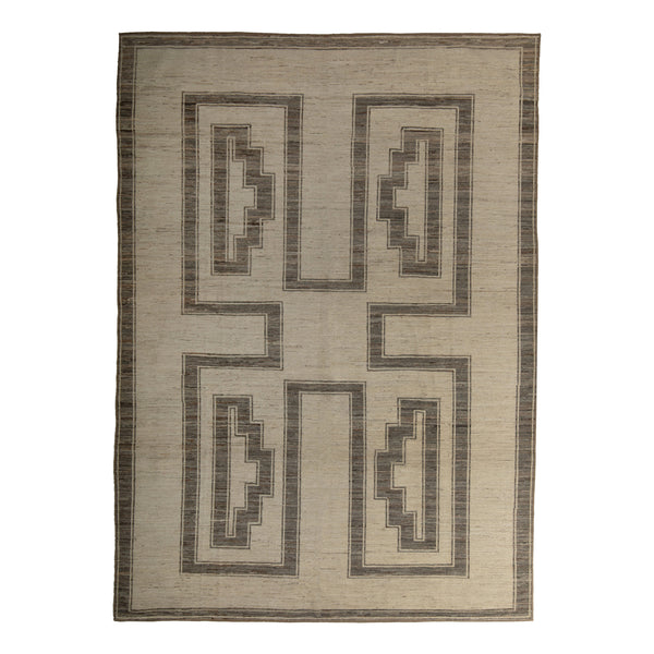 The Brown Zameen Transitional Wool Rug, measuring 9'1" x 12'9", offers a significant floor covering for various spaces. This rug blends the durability of natural wool with a hand-knotted construction, originating from Central Asia. Crafted from resilient wool, this rug is meticulously hand-knotted, a traditional technique known for creating enduring quality and a robust pile. This construction method ensures the rug's ability to withstand regular use while providing a comfortable texture underfoot. The design features a distinct geometric pattern in...