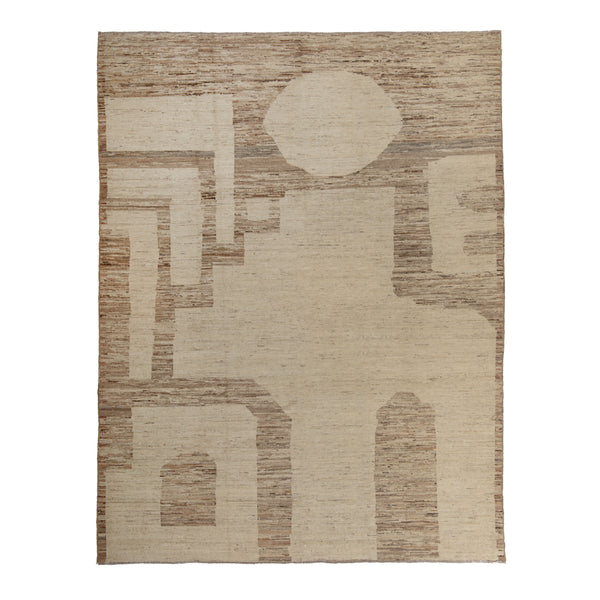 The Brown Zameen Transitional Wool Rug, measuring 9'5" x 12'3", offers a blend of traditional craftsmanship and modern design. This large area rug is hand-knotted from durable wool, providing both comfort and longevity for various living spaces. Crafted in Central Asia, this rug showcases the region's expertise in textile artistry. The construction features a hand-knotted technique, which contributes to the rug's strength and unique texture, ensuring it can withstand daily use in high-traffic areas. The design features an abstract geometric...